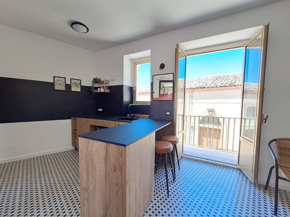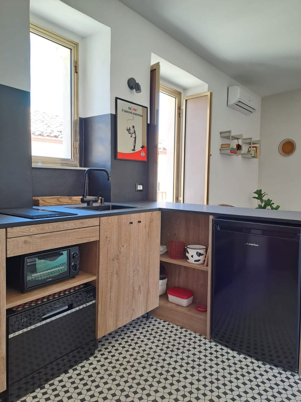 Cucina realizzata su misura a moduli in nobilitato effetto legno, lavello ed elettrodomestici ad incasso, mensole a sostituzione dei classici pensili.