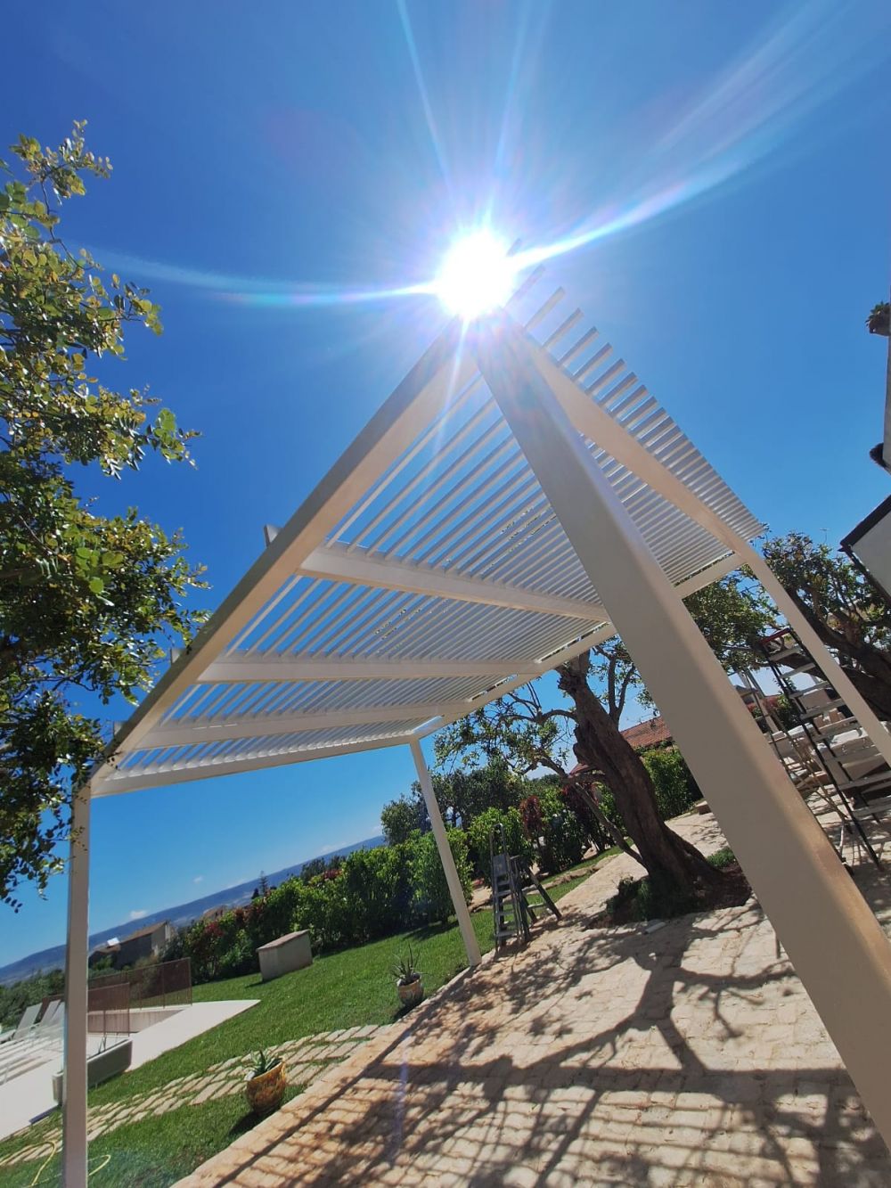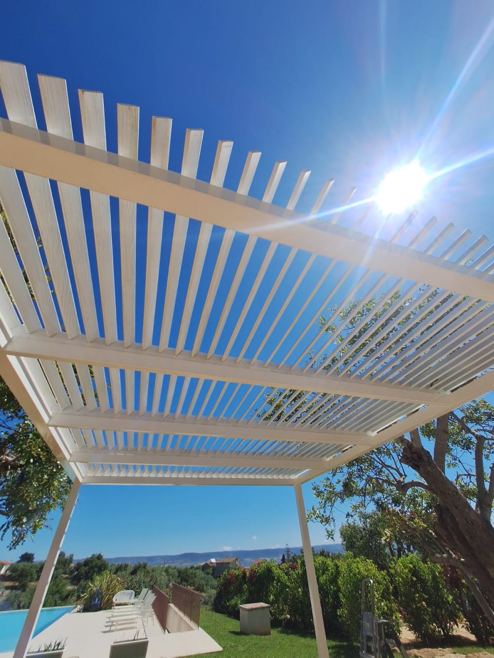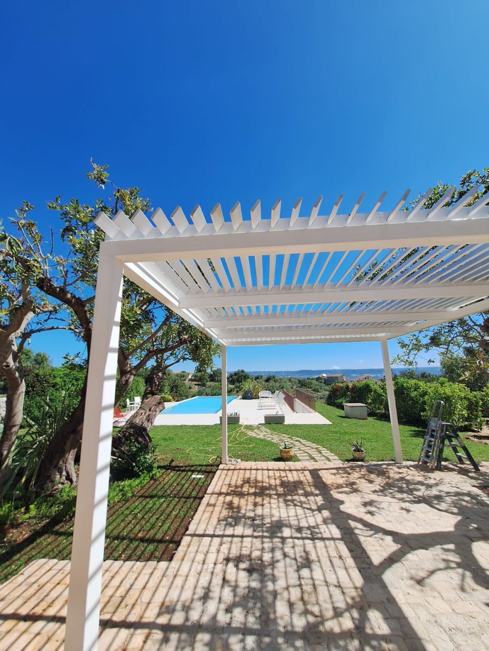 La copertura è composta da lamelle orizzontali parallele, tipo pergola, che lasciano filtrare la luce del sole creando un gioco di ombre lineari sul pavimento sottostante. Questo tipo di struttura è ideale per offrire ombra senza chiudere completamente lo spazio, mantenendo una sensazione di apertura verso l’esterno.